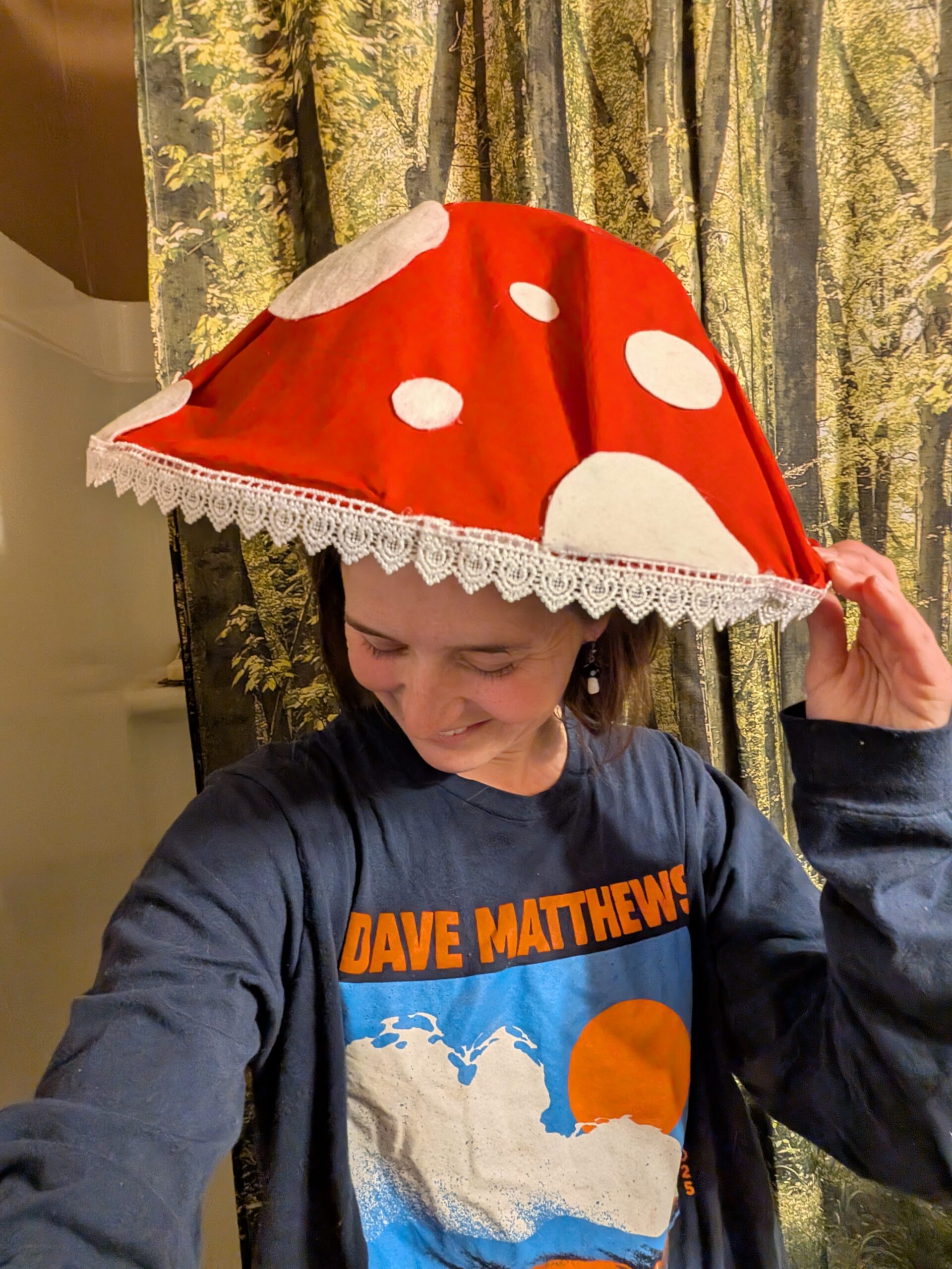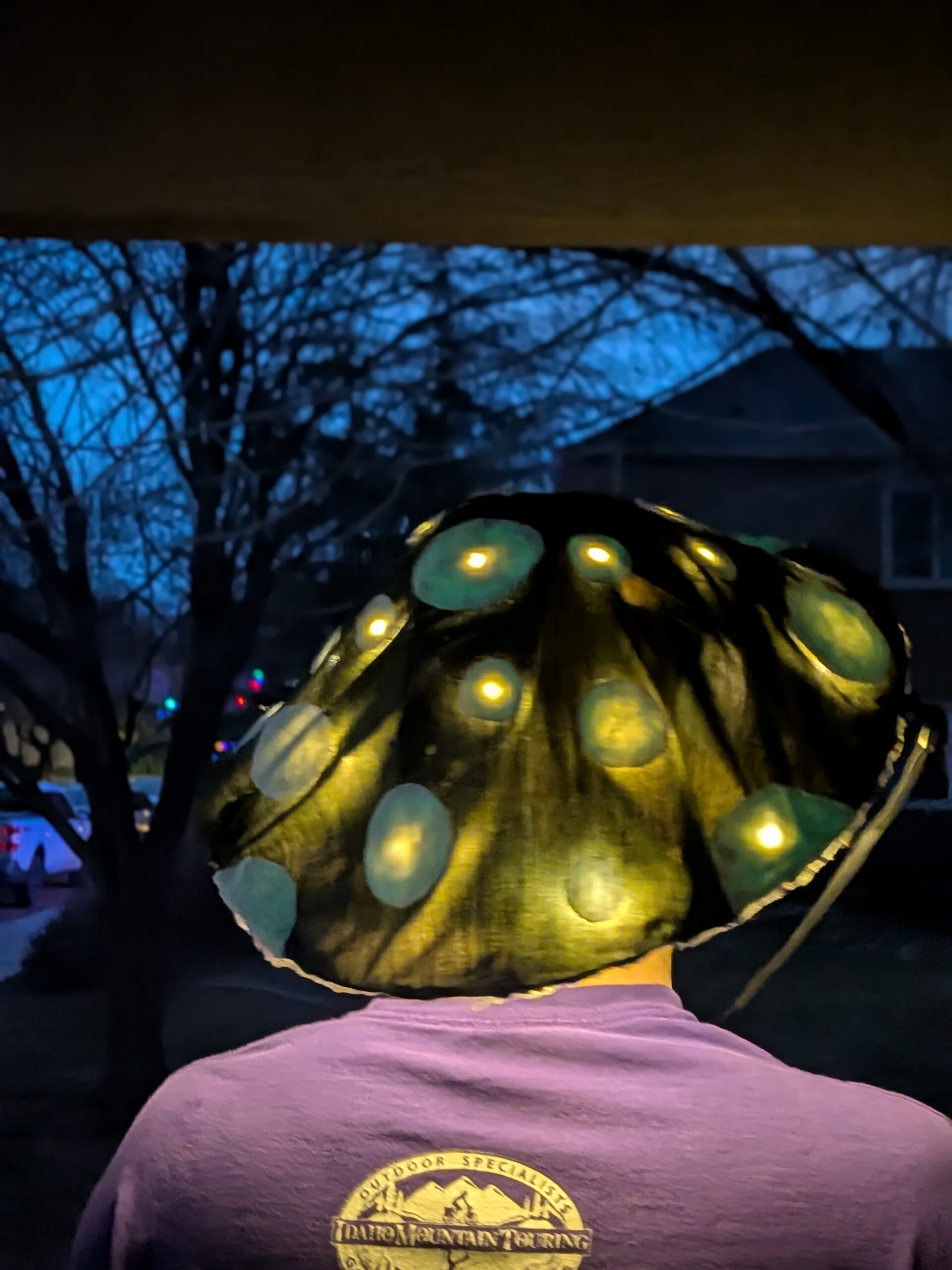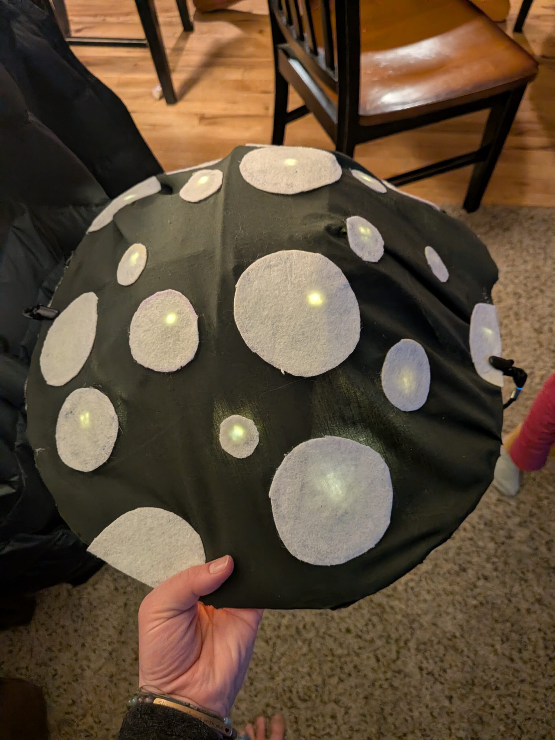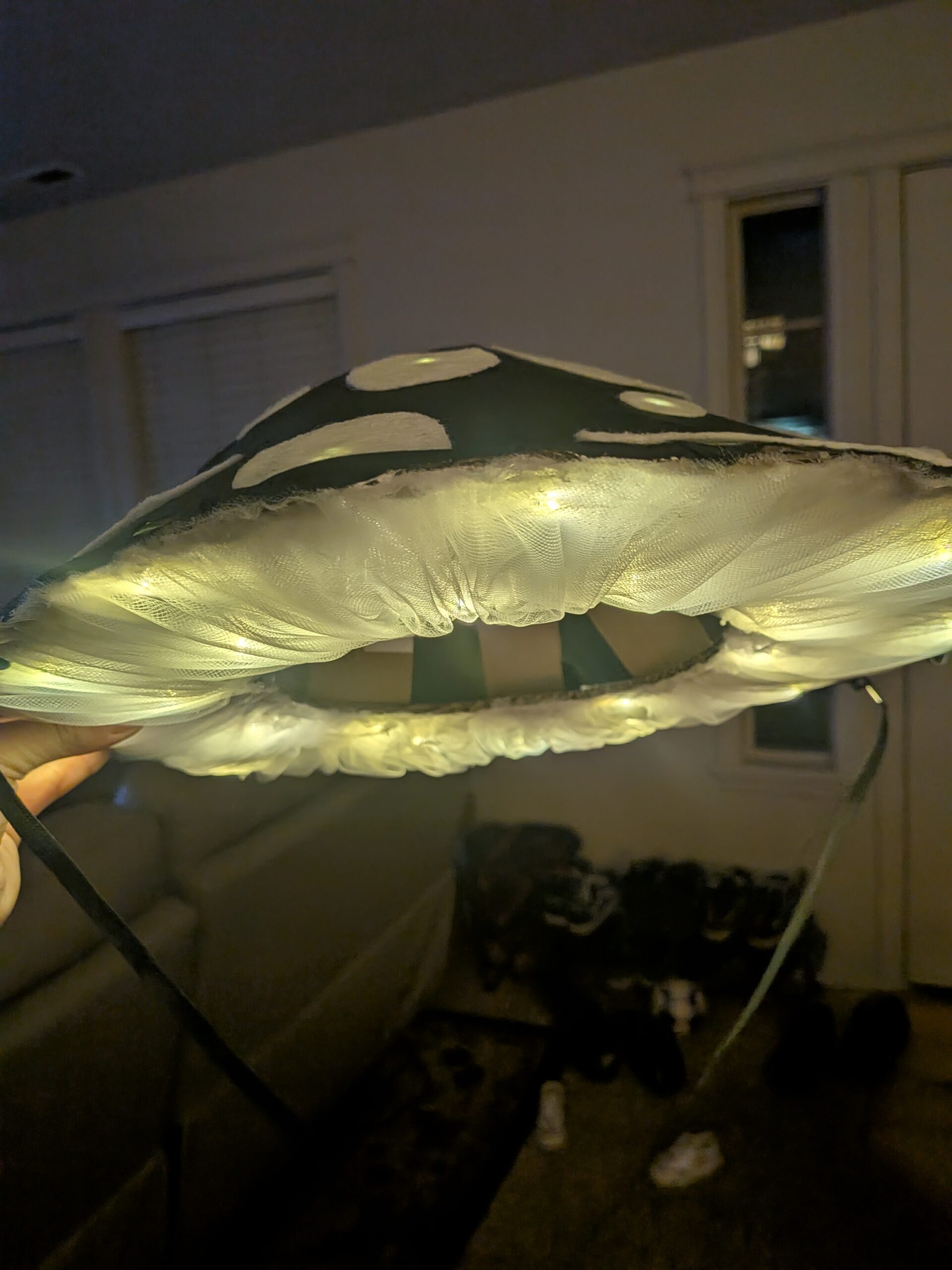 The base is made from recycled materials – light and easy to wear – with various fabrics decorating the outside to bring the mushroom to life. There are controllable lights on the top and underneath to give a soft glow in the dark. There’s a strap to keep it secure and be able to wear around your neck like a sunhat. You can go with the styles shown or can request a custom design with whatever colors you’d like!